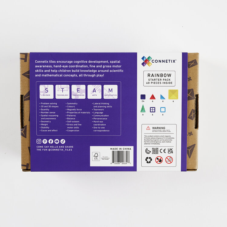 Alle magnetische tegels zijn gemaakt van niet-giftig ABS-plastic dat BPA- en ftalaatvrij is, verzegeld en geklonken voor extra veiligheid. Het unieke afgeschuinde ontwerp zorgt ervoor dat Connetix sterk is en tegelijkertijd prachtige heldere kleuren heeft.