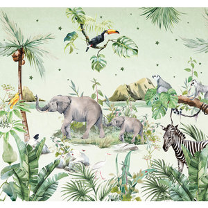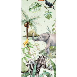 Een ontwerp met olifanten, een toekan, zebra en apen, een ware lust voor het oog.