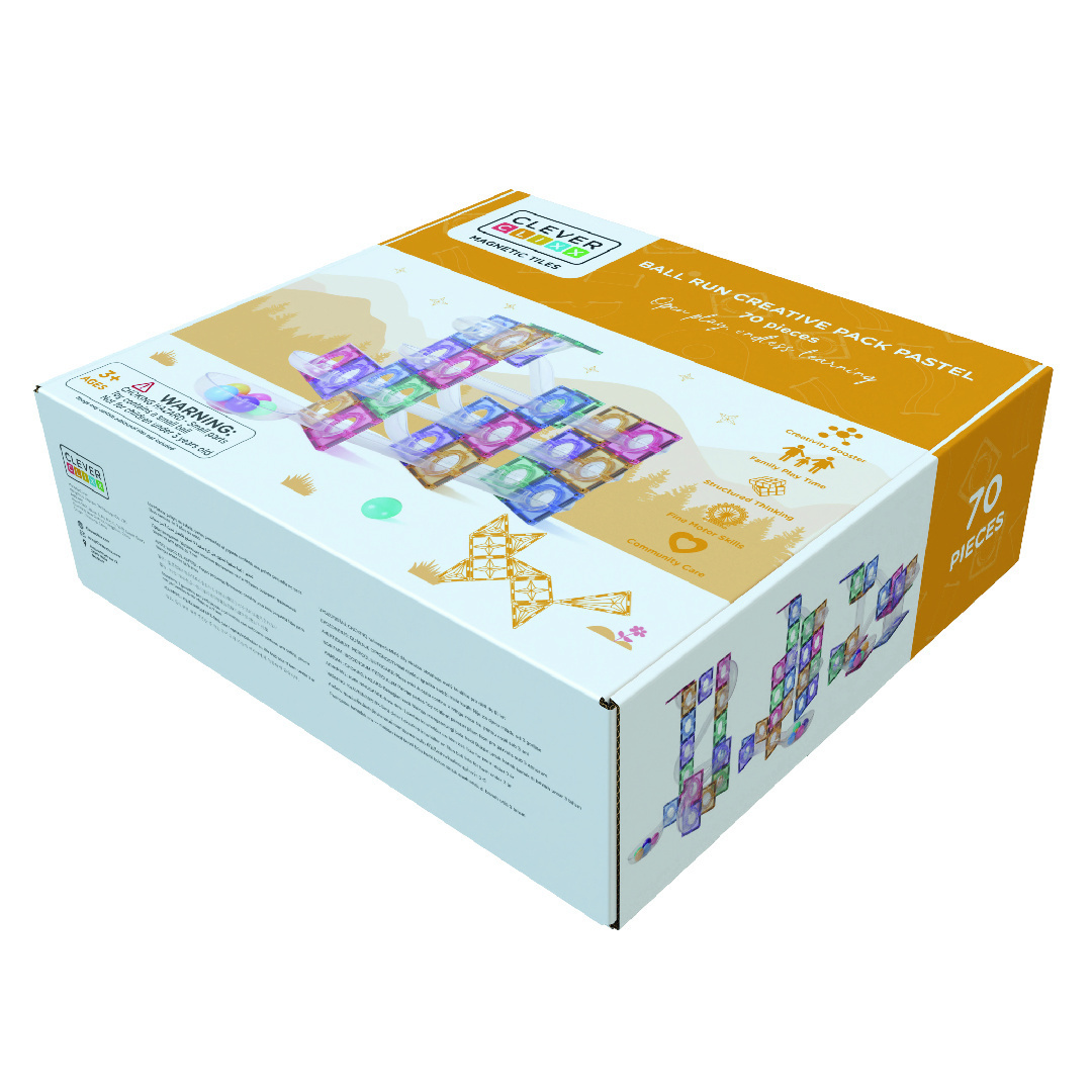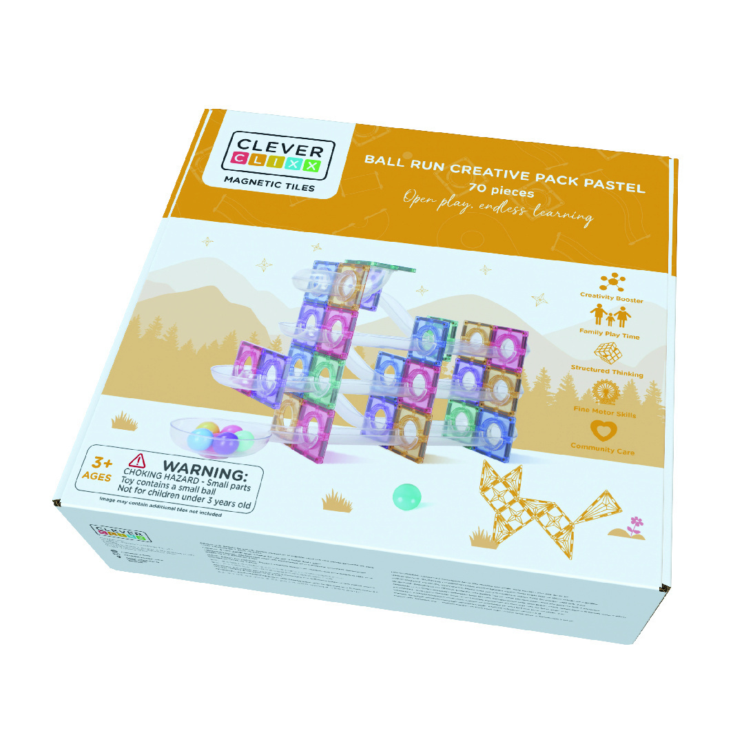 Deze ball run in pastelkleuren van Cleverclixx bevat 70 stuks. Met deze set kan je meteen een mooie start maken om te beginnen bouwen met onze magnetische tegels. Magneten hebben iets magisch en spreken bij kinderen sowieso tot de verbeelding. De creativiteit & fantasie van je kind is helemaal vrij bij het bedenken van leuke constructies en ideeën om te spelen met je favoriete Cleverclixx set. Alle sets zijn compatibel met elkaar dus je kan altijd uitbreiden.