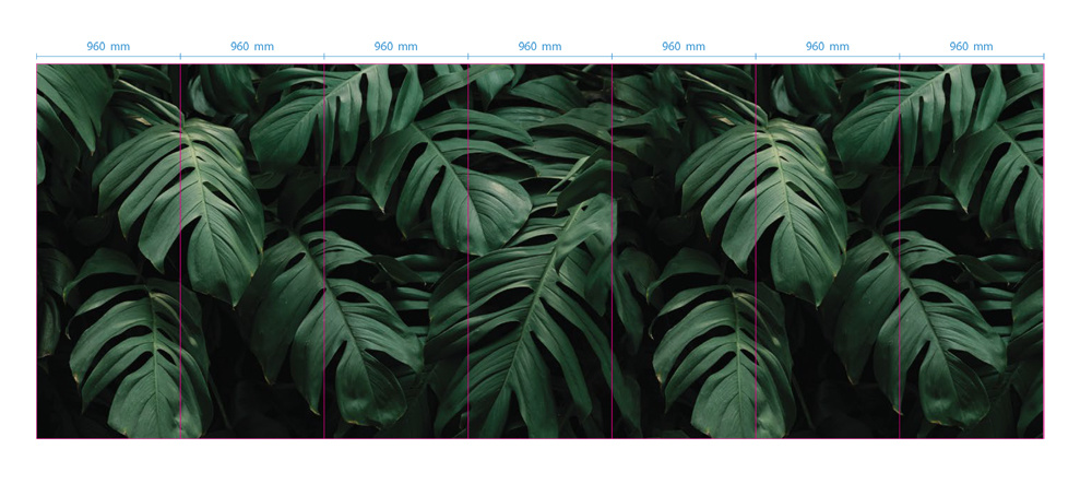 LET OP! Het behang is het mooiste wanneer meerdere rollen worden besteld. Bij afbeelding hieronder zie je wat er op 1 rol staat. 1 rol is 1 baan (tussen de paarse lijntjes)