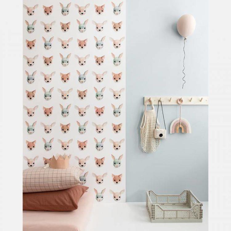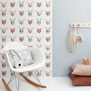 Dit lieve behang van Studio Ditte heeft een print van dierenkoppen. Lieve herten, konijnen en vossen kijken je aan bij dit gave Studio Ditte behang. Op een witte achtergrond schitteren prachtige dierenkoppen met hun mooie zachte kleuren.