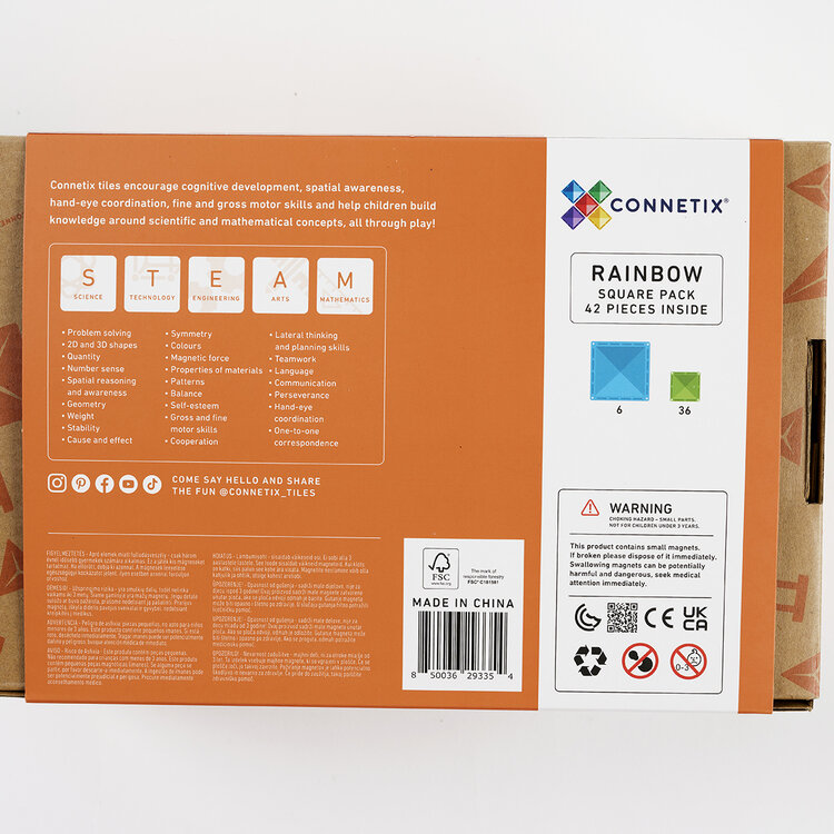 Dit pakket bevat standaard vierkanten in verschillende kleuren en grote vierkanten in groen en oranje. Het is het perfecte uitbreidingspakket om GROTERE Connetix-creaties te maken.