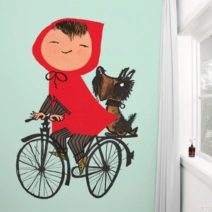 Fotobehang fietsend meisje, 243.5 x 280 cm is getekend door Fiep Westendorp en is kinderbehang voor een vrolijke en superleuke kinderkamer. Het behang van KEK Amsterdam is erg sterk, milieuvriendelijk en zeer eenvoudig aan te brengen.