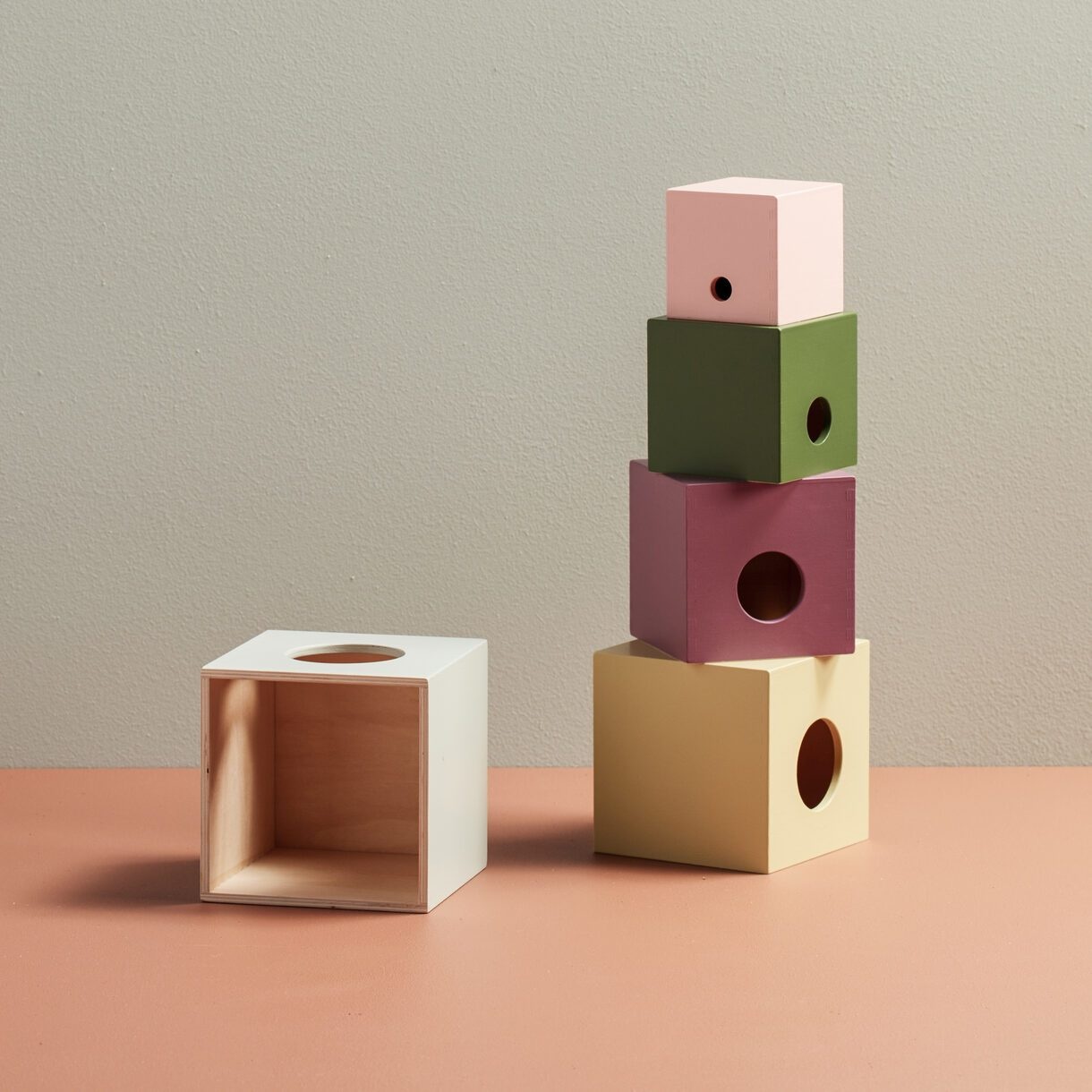 Stapelbare kubussen van hout in vrolijke kleurtjes. Op en in elkaar te stapelen en te sorteren van klein naar groot en andersom. Moedigt logisch denken aan, oefent motorische vaardigheden, coördinatie uit en kan het kind enkele uren in dienst nemen.