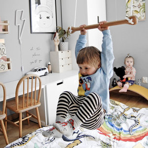 De trapeze is een echte eye-catcher voor in de kinderkamer en zelfs voor in de woonkamer. De Lillaguanga bone is van beukenhout en daarom zijn rekstokken ook geschikt voor buiten.