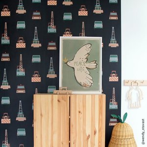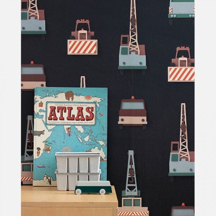 Supertof blauw behang met kraanwagens van Studio Ditte.