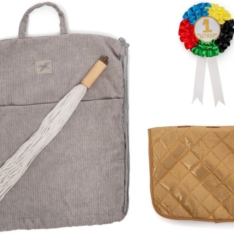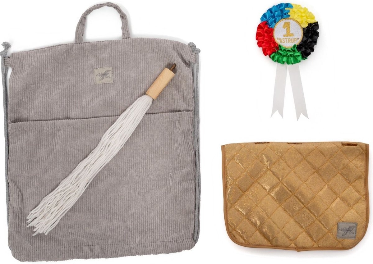Het is een mooi wit paard met daarbij een rozet in de kleuren van de Olympische ringen een gouden deken en uiteraard de tas.