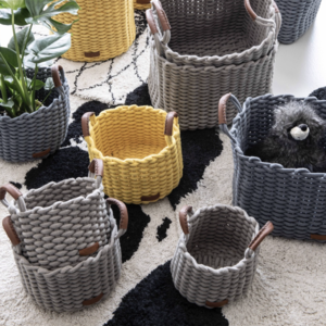 Twee opbergmanden van zacht koord mooi gevlochten met leatherlook handvaten
