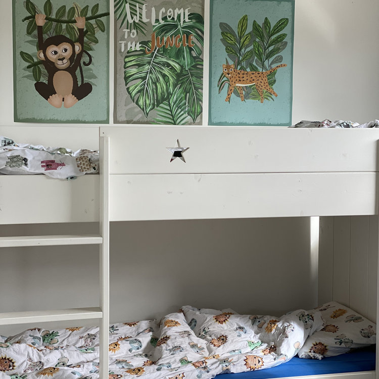 Kinderposters hang je op de muur in de Kinderkamer of Babykamer. Posters zijn een fijne en relatief goedkope muurdecoratie voor de kinderkamer of babykamer. Super leuk, want je kunt gemakkelijk een sfeer meegeven in de kinderkamer, zonder heel veel moeite te doen met bijvoorbeeld behang of muurstickers. Je vervangt de kinderposter gemakkelijk voor een nieuw exemplaar. Zo heb je steeds weer een nieuwe look in de kinderkamer. Dus ga je voor de ultieme jungle look? Dan mag de leuke jungle posters met aap voor de kinderkamer zeker niet ontbreken.