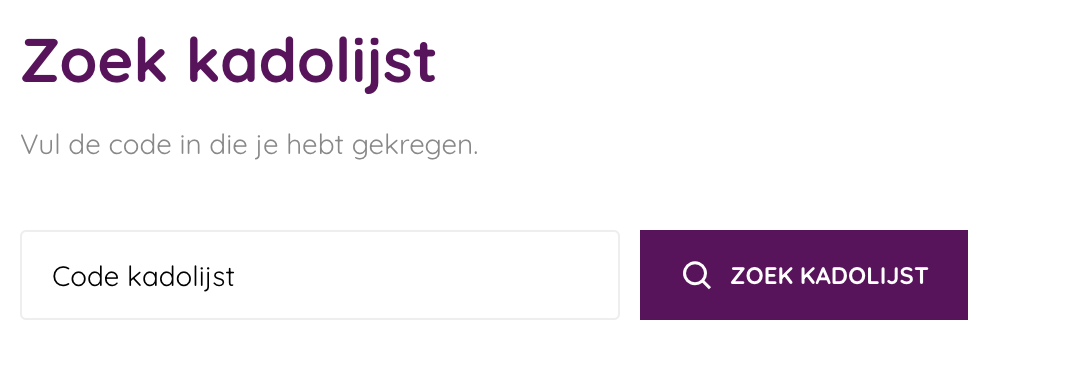 Vul in het vakje "code kadolijst" de code die je hebt ontvangen en druk daarna op de paarse knop "zoek kadolijst"