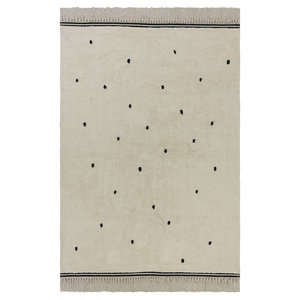 Supermooi rechthoekig vloerkleed wat zacht is voor aan de voeten. Het kindervloerkleed heeft een rechthoekige vorm en is creme van kleur. De mooie zwarte stippen erop geven het leuke sfeer.