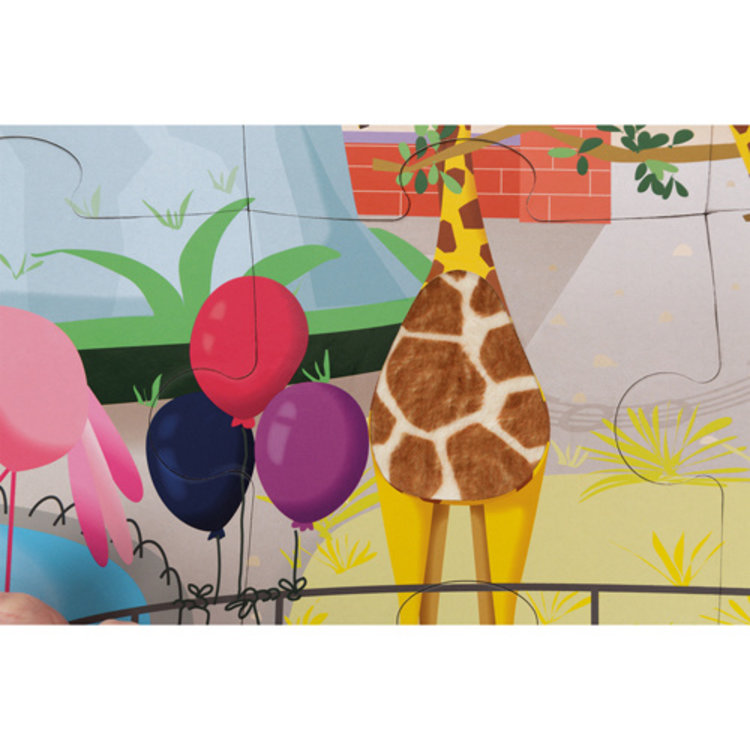 Een voelpuzzel van JANOD dieren uit de dierentuin erop, een puzzel voor kinderen vanaf 3 jaar. Reuzenpuzzel van 20 stukjes van stevig karton, met 7 beklede stukjes (vacht van aap, flamingo, wasbeertje, tijger, giraf,krokodil, mierenete
