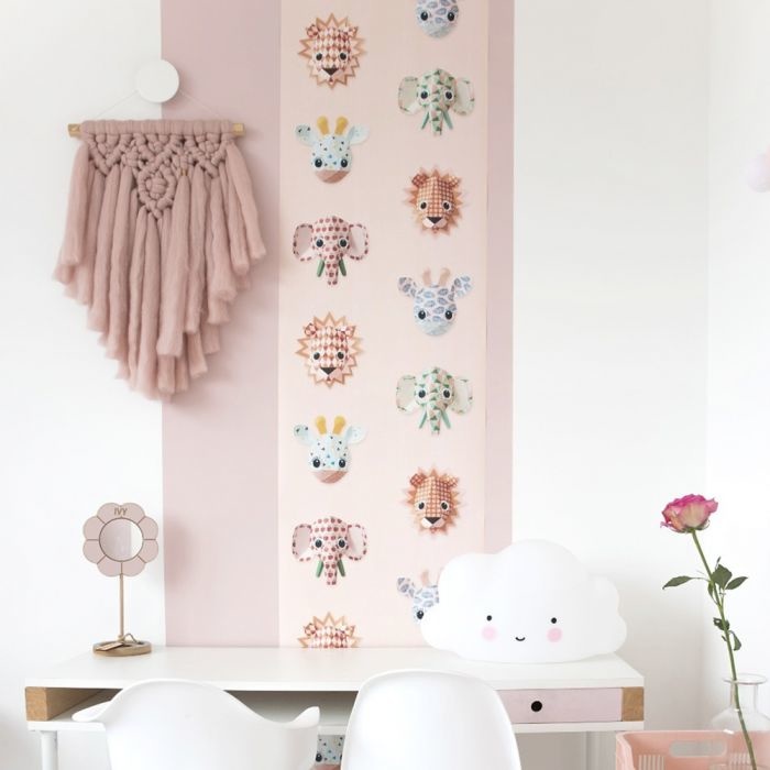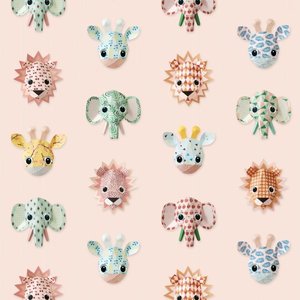 Elegante giraffen, lieve olifanten en grappige leeuwen schitteren op dit gave roze Studio Ditte behang. Een vriendelijke safari dieren met frisse kleuren en fijne printjes Op een roze achtergrond schitteren deze toffe dieren.